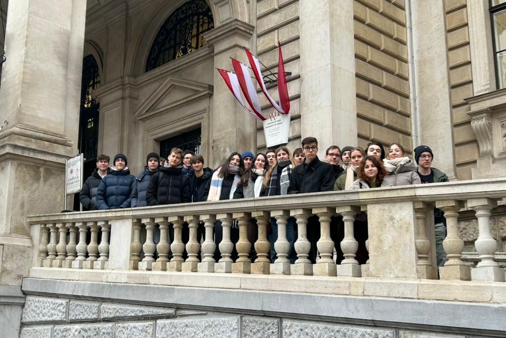 Nach einer kurzen Mittagspause ging es weiter in die Innere Stadt, an den Ring und in das ehrwürdige Hauptgebäude der Universität Wien. Dort führte eine Studierende die Schüler:innen durch die Räumlichkeiten, berichtete über die Geschichte des Hauses und beantwortete Fragen rund ums Studieren sowie zum „Punkte sammeln“ im ECTS-System.
