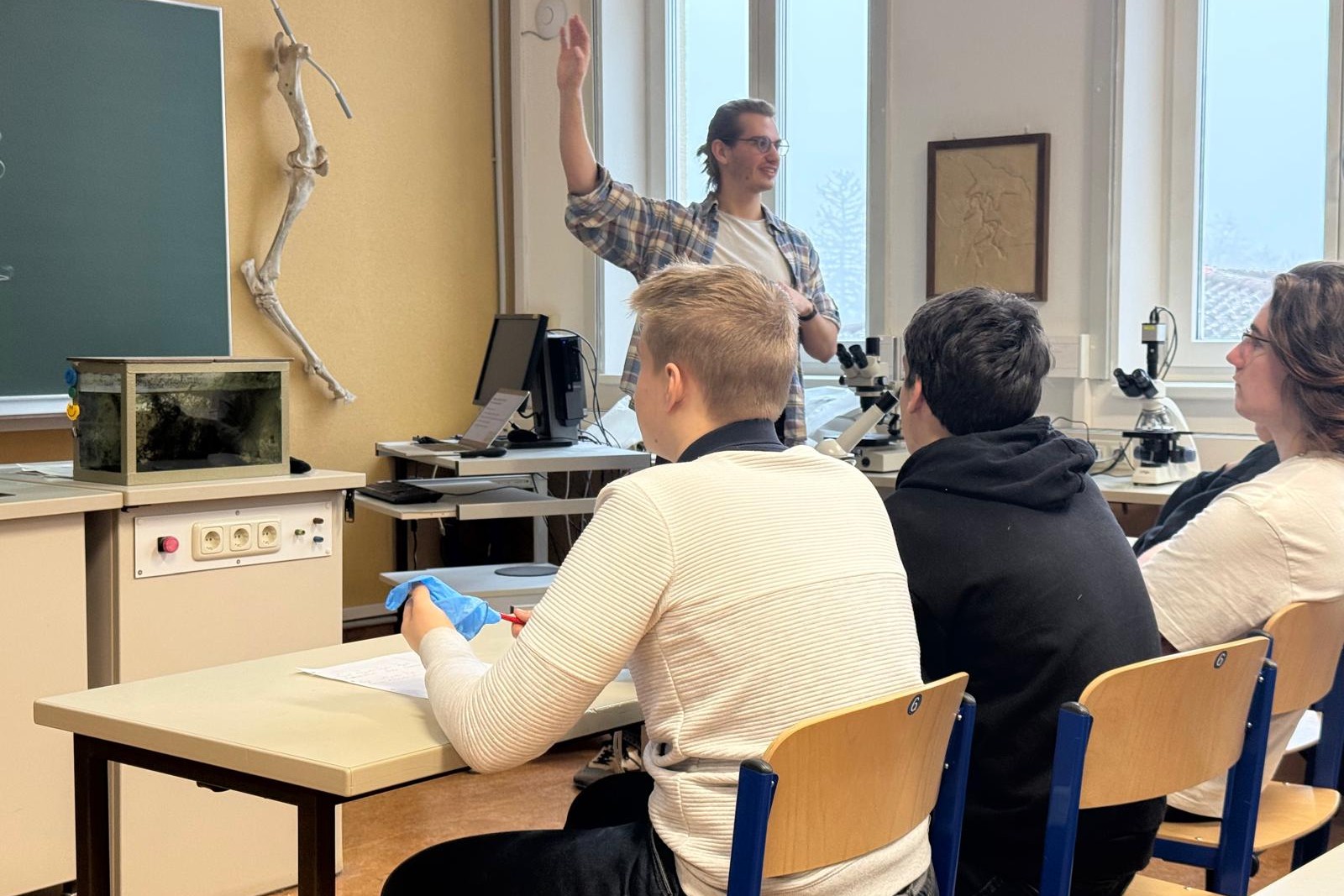 Er hat in einem zweistündigen Vortrag mit eingebauten Versuchen interessierten Schüler:innen der Oberstufe die Arbeit in der Wissenschaft und das Axolotl näher gebracht. Die Schüler:innen waren begeistert bei der Sache, als es darum ging, Planarien zu zerteilen. In einem weiteren Versuchsansatz beobachteten die Schüler:innen Planarien, die vor drei Tagen zerteilt wurden und wie sich ihr Körper seither schon wieder regeneriert hat.