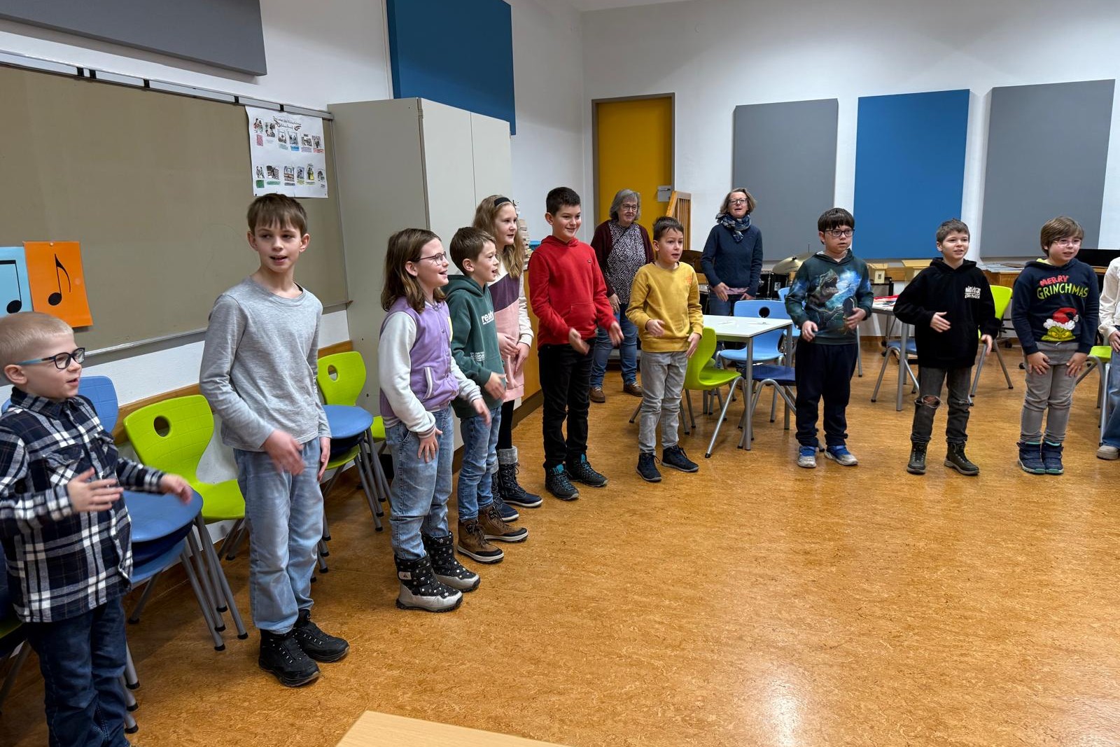 Zum Abschluss gab es im Festsaal noch gepimptes Wasser mit Organgen-, Zitronen- oder Gurkengeschmack. Nach dem Gruppenfoto bei unserem Christbaum in der Aula ging es für die Volksschüler:innen wieder zurück in die Volksschule.